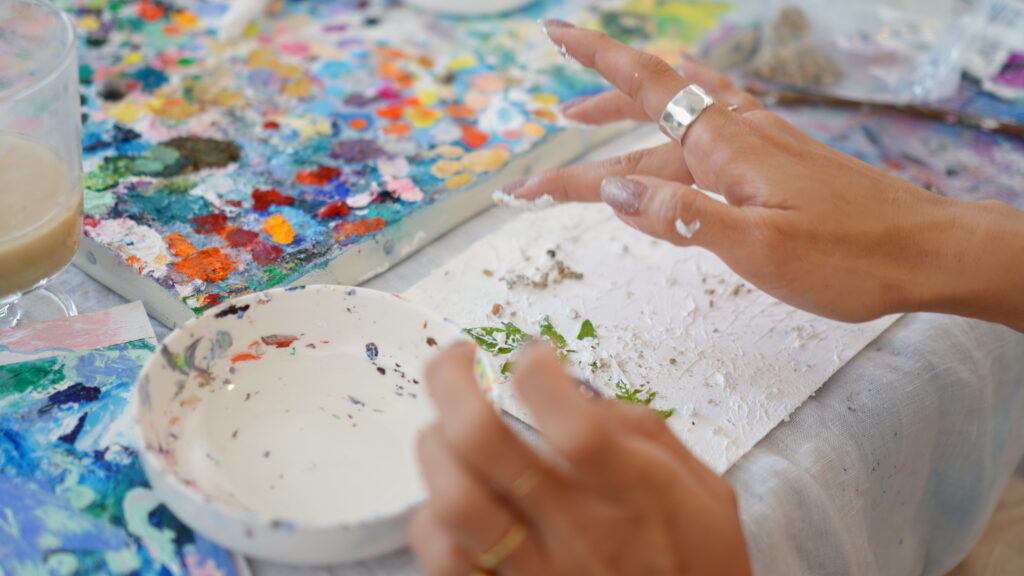 ご自身の手で指で色に触れ、色を創り真っ白のキャンバスに思うがままに向かう